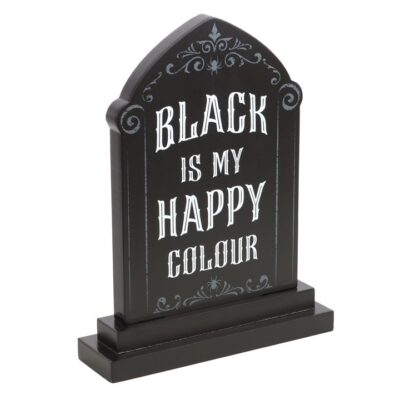 Offering a nod to the darker side of decor, this gothic style sign tombstone conjurs images of a fog-shrouded graveyard, adding a mysterious touch to any setting. Featuring the wording ‘Black is My Happy Colour’ this sign is a statement piece for lovers of all things dark and eerie.