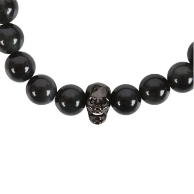 Experience the unique combination of mystique and style with this Black Obsidian Bead Bracelet, featuring an eye-catching black stainless steel skull charm. Designed with an elasticated band, this bracelet ensures a comfortable and flexible fit for any wrist. Black obsidian is often associated with protection, grounding, and the absorption of negative energy. This, paired with the skull symbol, conveys strength and resilience, embodying a bold statement of endurance and personal power. Jewellery is nickel free.