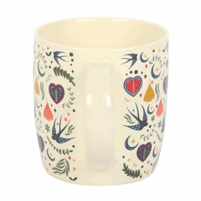 Enjoy a calming cuppa with this cream ceramic mug decorated in the enchanting Midnight Bloom floral print. A pretty and practical addition to any home or a lovely gift for someone who enjoys a touch of folk-inspired design. 350ml capacity. Microwave safe. Dishwasher safe.