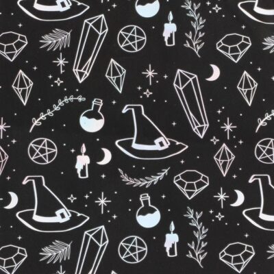 This trendy Polycotton tote bag is a fun and unique gift for any crystal collector or for anyone to stay in touch with their witchy side. Adorned with designs of crystals, witch hats and potions on a black Polycotton canvas. Includes ample space for sustainably carrying everyday essentials or for shopping. Made from 95% Polyestser, 5% Cotton. Hand wash only.