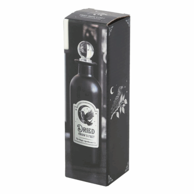 Add a spooky touch to your gothic décor with this decorative glass potion bottle labeled “Dried Crow’s Feet.” Perfect for display on shelves, desks, or altars. For decorative purposes only.