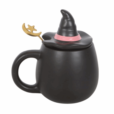 Add a touch of everyday magic to your brew with this pink “Good Witch” mug. This witchy mug features a removable ceramic lid shaped like a whimsical witch’s hat, perfect for keeping your drink warm. Accompanied by a gold-tone metal spoon adorned with a delicate crescent moon, it’s ideal for hot drinks, gifting to a fellow good witch, or simply bringing a little enchantment to your daily routine. Not suitable for microwave use. Hand wash only.