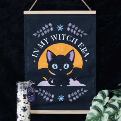 Bring magical vibes to any room with this fabric wall hanging showcasing the phrase ‘In My Witch Era’ alongside a charming bat-winged black cat. Ideal for those who love showing off their witchy side.