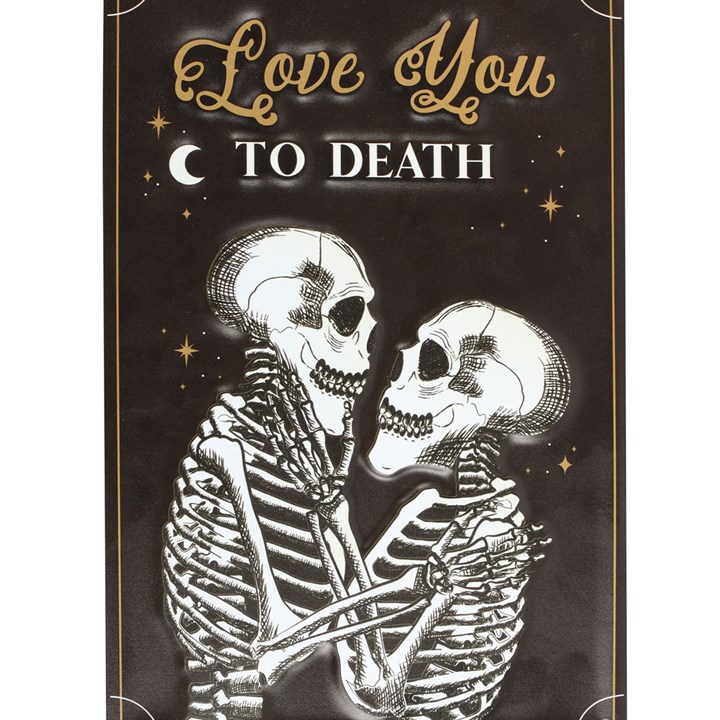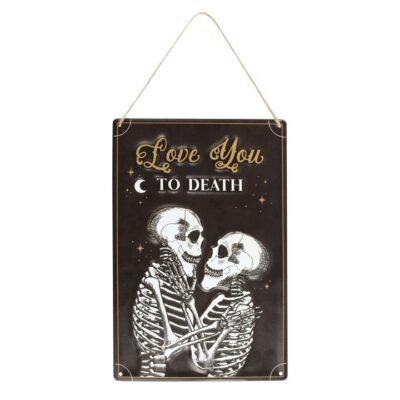 This hanging metal sign is perfect for showing your undying affection. Featuring a romantic skeleton couple in an eternal embrace and ‘Love You To Death’ text, this sign makes a great gift to commemorate love and togetherness.