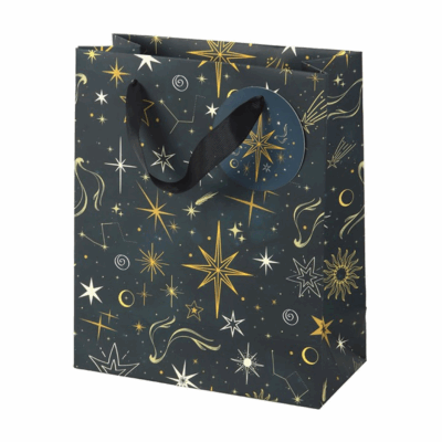 Make gifting extra special with this enchanting Starry Night paper gift bag. Decorated with golden stars against a deep navy background, this medium-sized bag adds a touch of festive magic to presents big and small. 23cm.