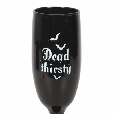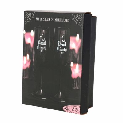 Celebrate with a gothic twist using this set of 2 ‘Dead Thirsty’ champagne flutes. Featuring a sleek black design, they’re perfect for spooky celebrations, weddings, or special occasions with a touch of flair. 300ml. Not suitable for microwave use. Handwash only.