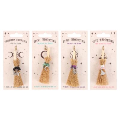 This display of lucky crystal broomstick car charms feature 4 magickal designs perfect for attracting luck, peace, protection and love. The charm designs include a crescent moon with green aventurine crystal chips, a pentagram with amethyst crystal chips, a triple moon with black onyx crystal chips, and a witch hat with rose quartz crystal chips. Sold as a set of 24 with 6 of each design on a matching mdf countertop display.