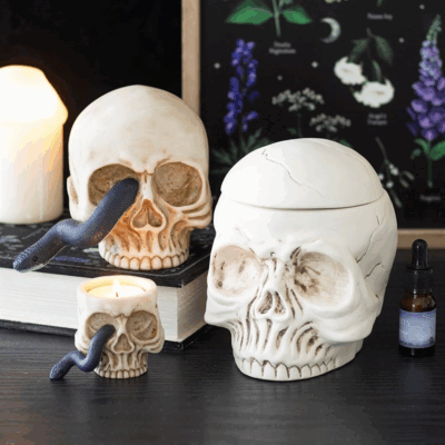 Add a hauntingly beautiful touch to the home with this skull-shaped tealight holder. Featuring a realistic, intricate skull design with a serpent weaving its way through the eye socket, creating a statement and dramatic presence in any space.