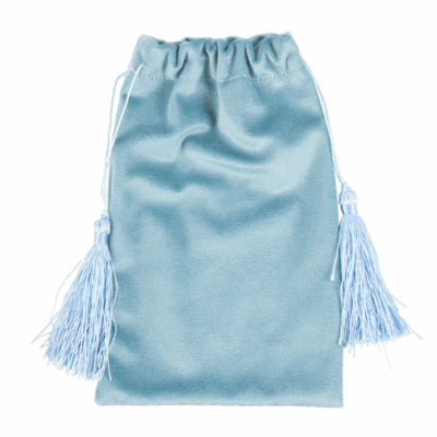 A soft teal velvet drawstring bag featuring a gold printed The Moon tarot card design. Ideal for storing tarot decks, crystals, or small accessories.