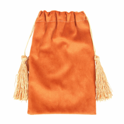 A soft tan velvet drawstring bag featuring a gold printed The Wheel tarot card design. Ideal for storing tarot decks, crystals, or small accessories.