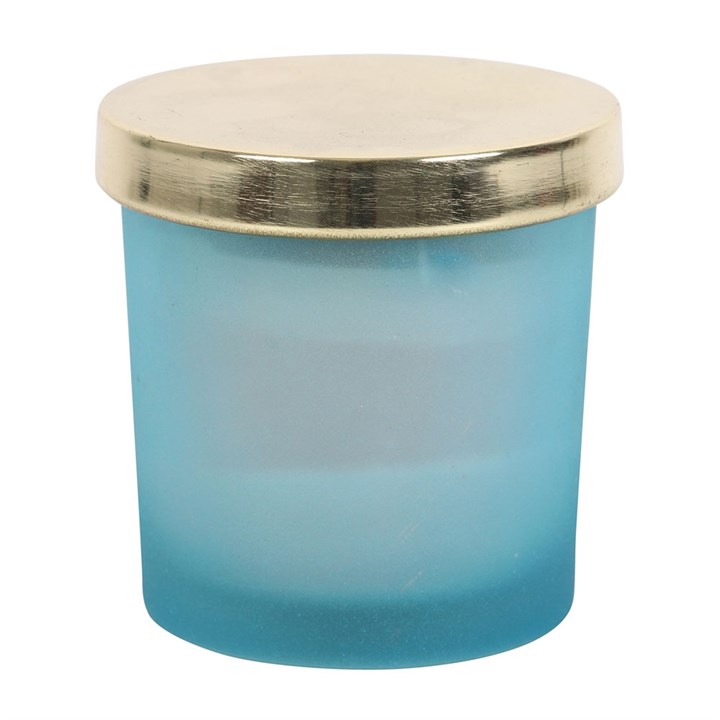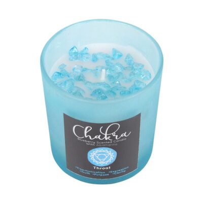 Realign the Throat chakra with this stunning Blueberry fragranced candle. A blue frosted glass holder and metallic lid are accented by a scattering of aquamarine crystal chips that can later be reused for a multitude of spiritual purposes. Paraffin wax. Approximate burn time of 25 hours. Please practice caution when burning and never leave lit candle unattended.