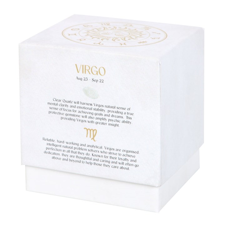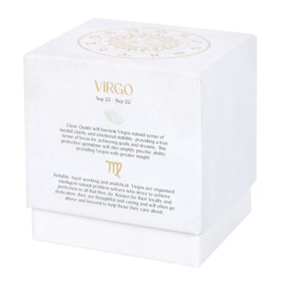 Bring power and positivity to individuals born between August 23 and September 22 with this stunning Virgo zodiac candle. A Sandalwood & Patchouli fragrance is accented by a sprinkling of clear quartz crystal chips that can later be reused for a multitude of spiritual purposes. Clear quartz will harness a Virgo’s natural sense of mental clarity and emotional stability, providing a true sense of focus for achieving goals and dreams. This protective gemstone will also amplify psychic ability, providing Virgos with greater insight. Packaged in a matching sliding box that’s perfect for gifting and display. Paraffin wax. Crystals will release from wax with use. Approximate burn time of 21 hours. Please practice caution when burning and never leave lit candle unattended.