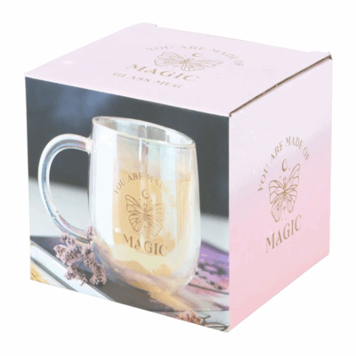 With the pefect combination of style and function, this double walled glass mug is perfect fpr keeping beverages hot or cold while adding a touch of magic to every sip. The mug features a beautiful mystic butterfly design with the words ‘You are made of magic’ displayed in gold over an irridescent inner finish. For best use, pre-warm the mug with warm water before adding hot liquids, and avoid sudden temperature changes. 300ml capacity. Handwash only. Do not microwave.